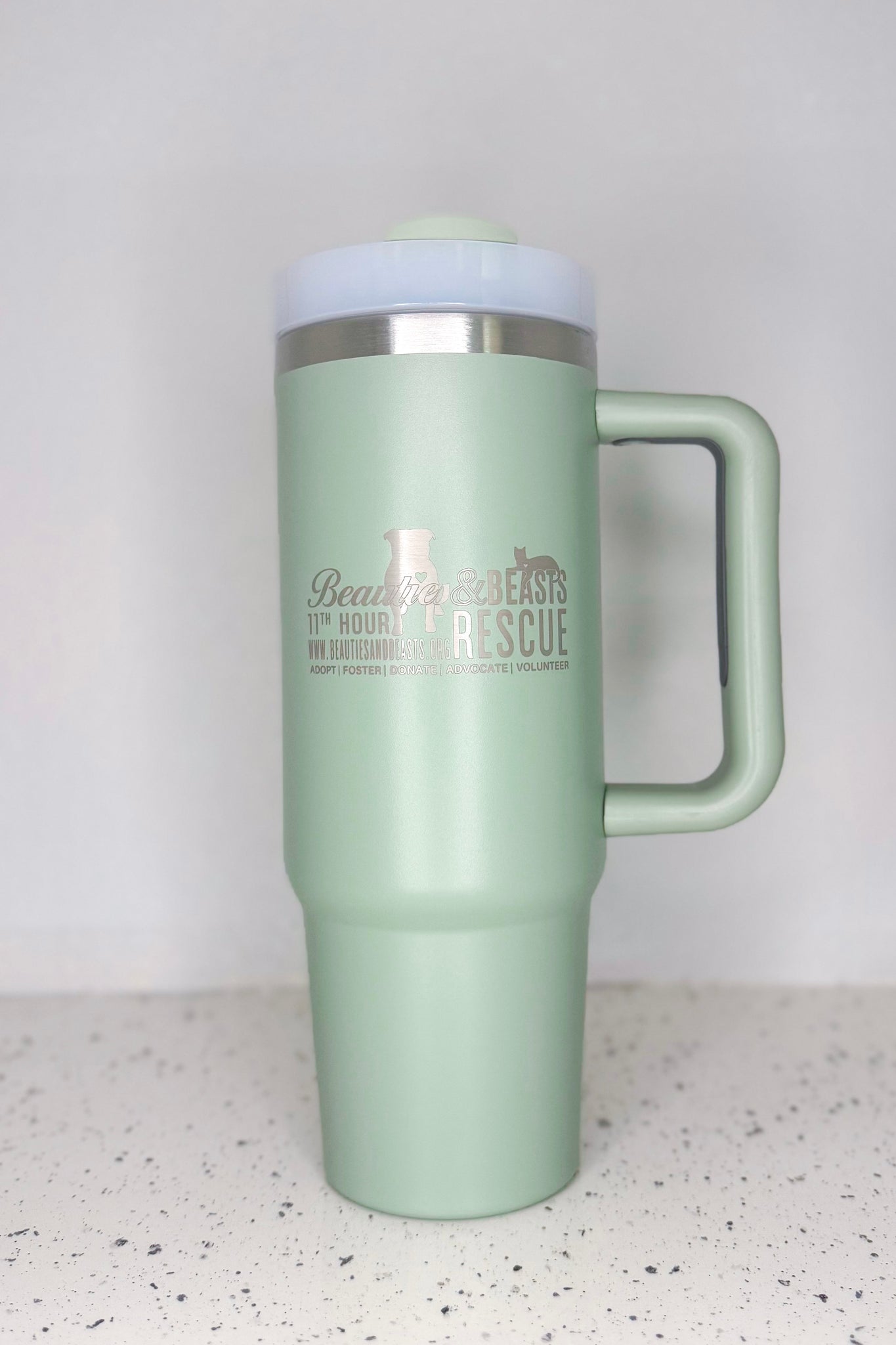 Hydration meets mission. This 40oz Stanley-style tumbler is built to keep your drinks at the perfect temperature and your rescue spirit on full display. With a sleek design, sturdy handle, and Beauties & Beasts logo, it’s the perfect companion for busy mornings, road trips, or adoption events.